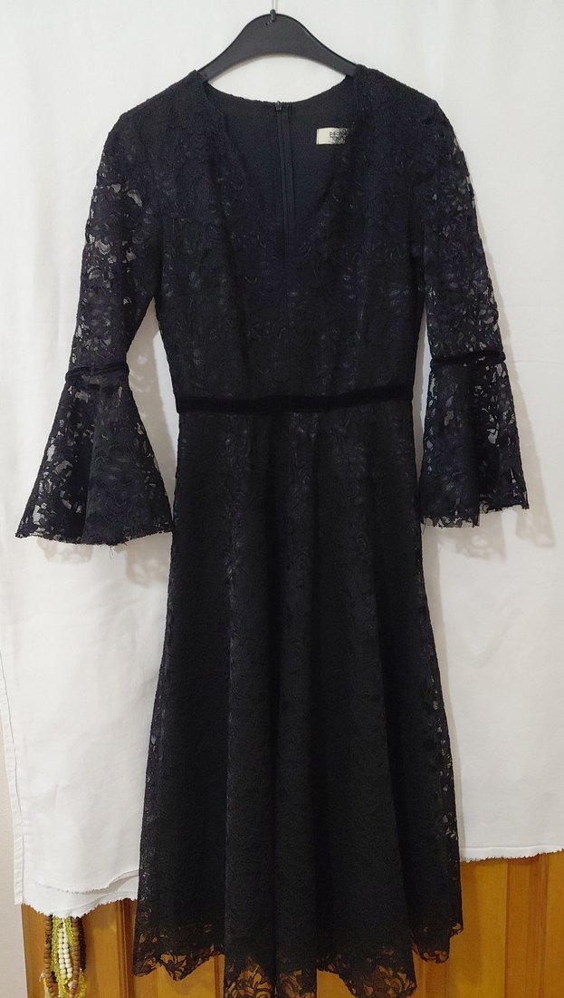 Siyah, dantel işlemeli uzun kollu, V yaka ve fit kesim uzun elbise. Gotik düğünler için klasik şıklık sunar. uzunluk112cm beden genişlik kol altından arkalı önlü90cm astarlı kumaşı esnek değil