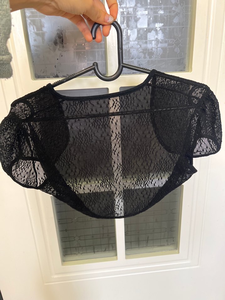 Siyah dantelli ve strappy kollu, straplez kesim kadın bolero, goth tarzı için uygun, vücuda oturan model.