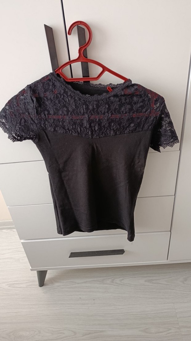 Siyah, kolları ve önü dantelli, vücuda oturan kadın bluz.bir kere giyildi.s-m beden uyumlu