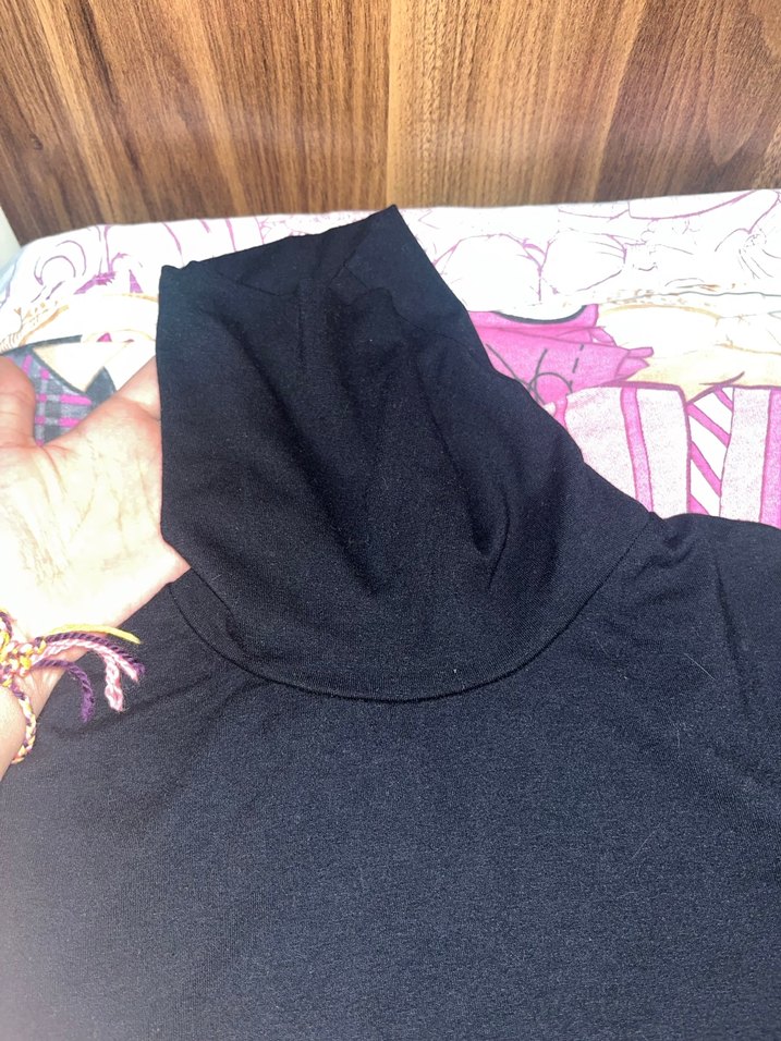 Dar kesim, siyah renkli, düz desensiz bluz, normal boyda ve athleisure tarzına uygun. Marka ve beden etikette yazmıyor maalesef ama ben 34 giyiyorum benim üstüme oturuyor sadece kol altı bol geliyor