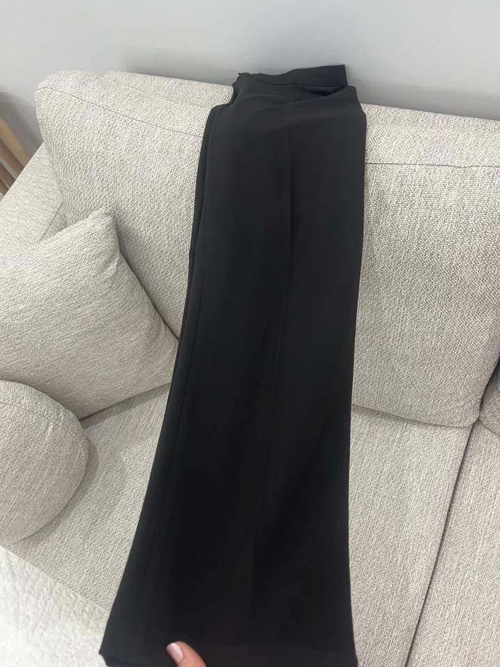Kadınlar için siyah, dar kesim uzun pantolon, yırtmaç detayı ve pürüzsüz sentetik kumaştan üretilmiştir, minimalist ve trend günlük stil için uygundur.