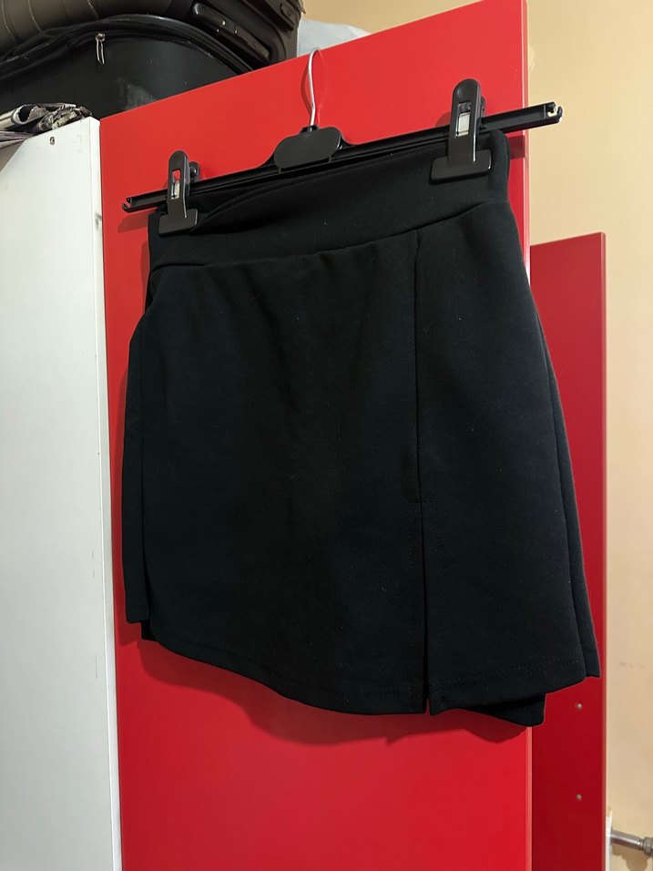 Düz siyah, dar kesim mini etek, yumuşak sentetik kumaştan, desen içermeyen sade tasarım. Rahat ve şık sokak stili.