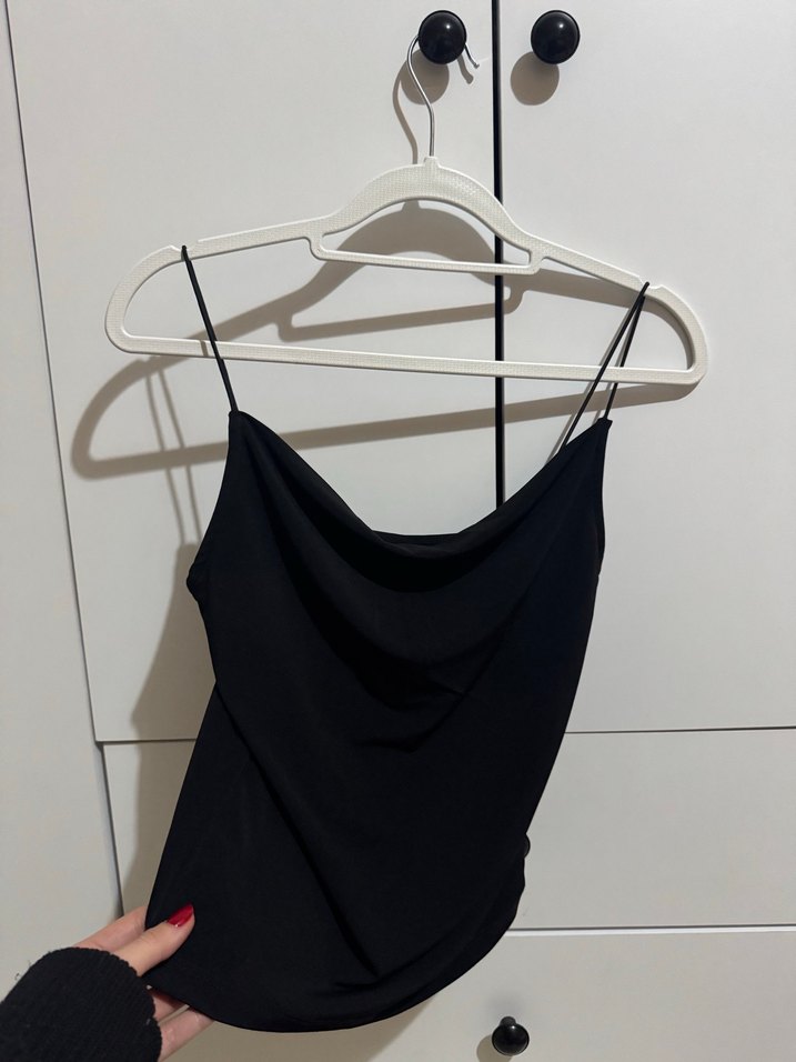 Kadınlar için ince askılı, degaje yakaya sahip, siyah ve ipeksi dokulu, normal boyda ve dar kesim bir atlet. Minimalist sokak tarzına uygun. Hem şık hem spor kombinlenebilen be basic bir parça 1-2 kez kullanıldı