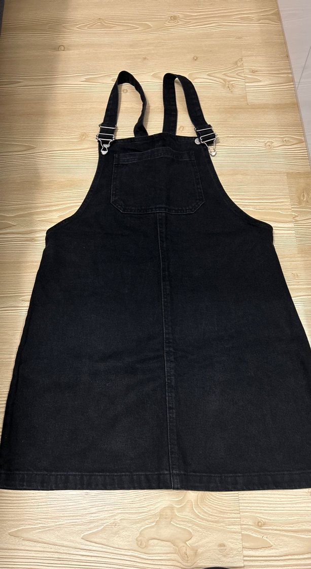 Siyah denimden yapılmış, ayarlanabilir tokalı askılara ve yüksek yakaya sahip midi boy kısa salopet, günlük kullanım için rahat kesimli ve sokak tarzı.