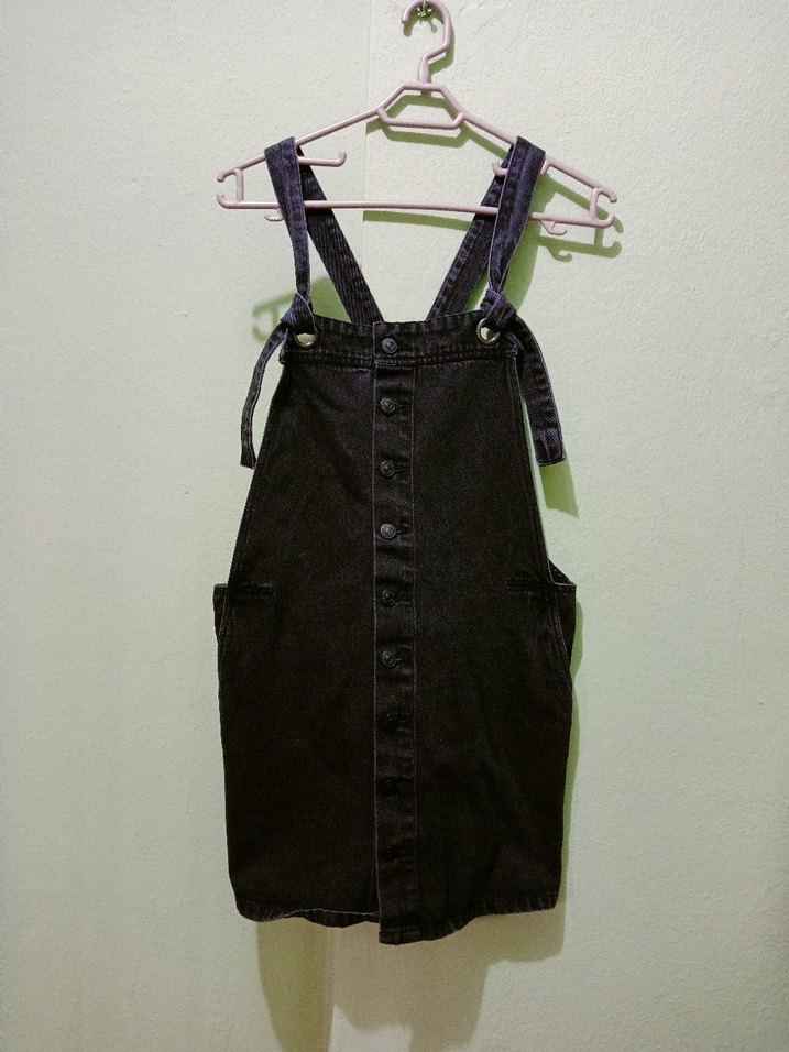 Fitted siyah denim askılı midi salopet, yüksek yakalı ve tokalı askılarla, batik desenli. Günlük sokak stili için uygun.