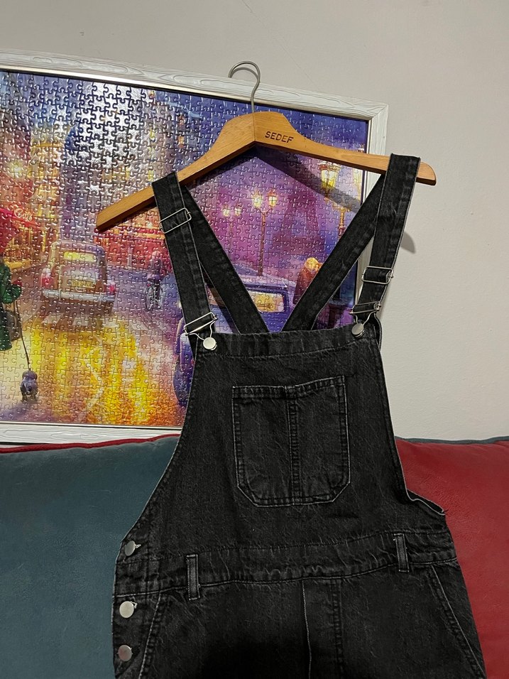 Siyah denimden, askılı ve tokalı bantlara sahip, yüksek yakalı, bağlama desenli, midi boy ve sokak stilinde kadın tulumu. Hiçbir defo yok 1 kere giyilmiştir M/38 Beden.