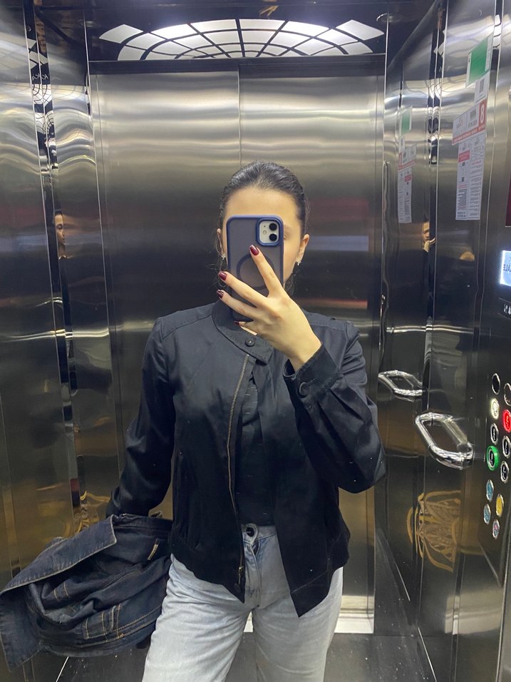 Kadın siyah transparan denim bomber ceket, yüksek yakalı ve uzun kolludur. Regular kesim ve midi boyda, sokak stili için uygundur.