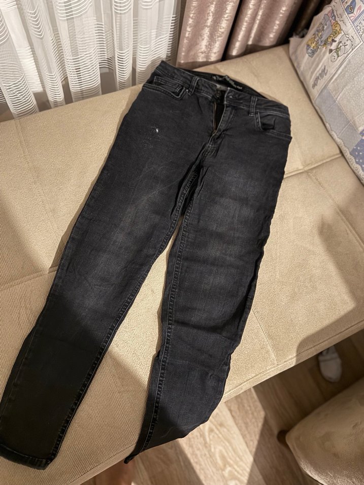 Siyah dar kesim denim kot pantolon, tokalı detaylı, normal boyda, günlük kullanıma uygun rahat sokak stili.