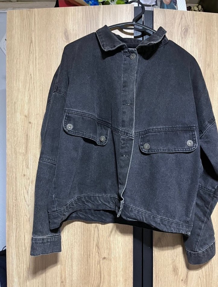 Bu siyah denim ceket, uzun kollu ve yaka detaylı, düğmeli ve cep kapaklıdır. Salaş kesimi günlük rahat sokak stiline uygundur.