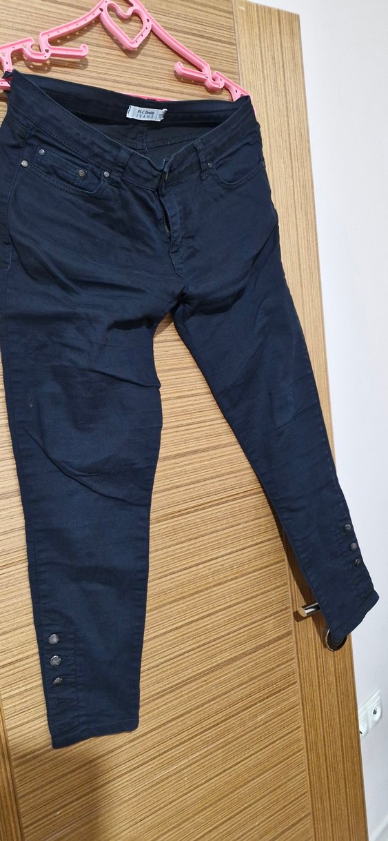 Kadın siyah denim pantolon, düğmeli ve rahat kesimlidir. Normal midi boyu ile günlük şıklık için uygundur.