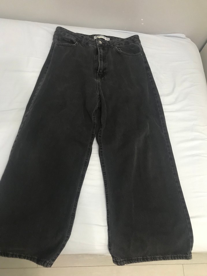 Geniş paça, normal midi boyunda siyah denim pantolon. Desensiz, günlük kullanıma uygun rahat ve şık bir model.