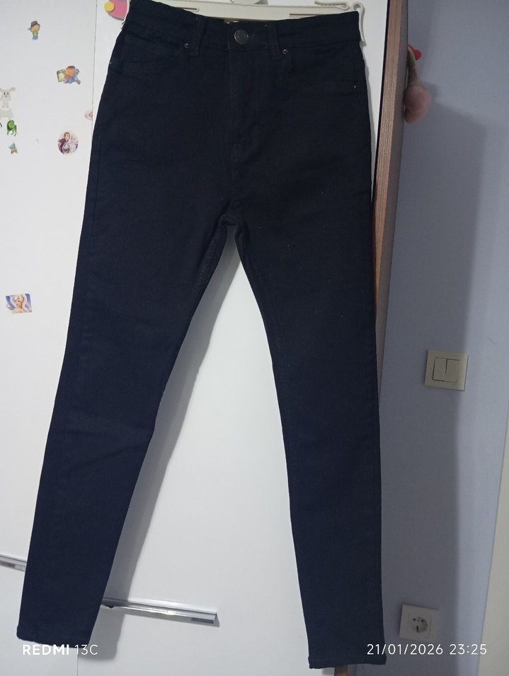 Siyah sıfır yeni bir regular fit denim jean. Desensiz, günlük sokak stili için rahat ve trend görünüm sunar.xs s bedene uyumlu