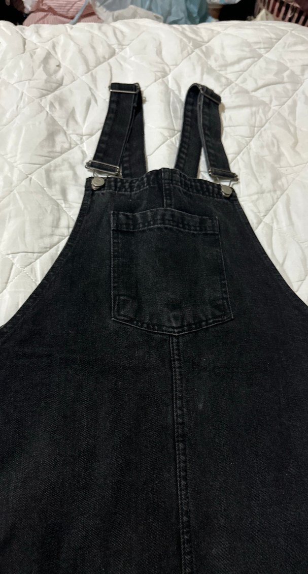 Ayarlanabilir tokalı askılara ve ön cebe sahip siyah denim kısa tulum. Günlük rahat kullanıma uygun, vücuda oturan kesim.