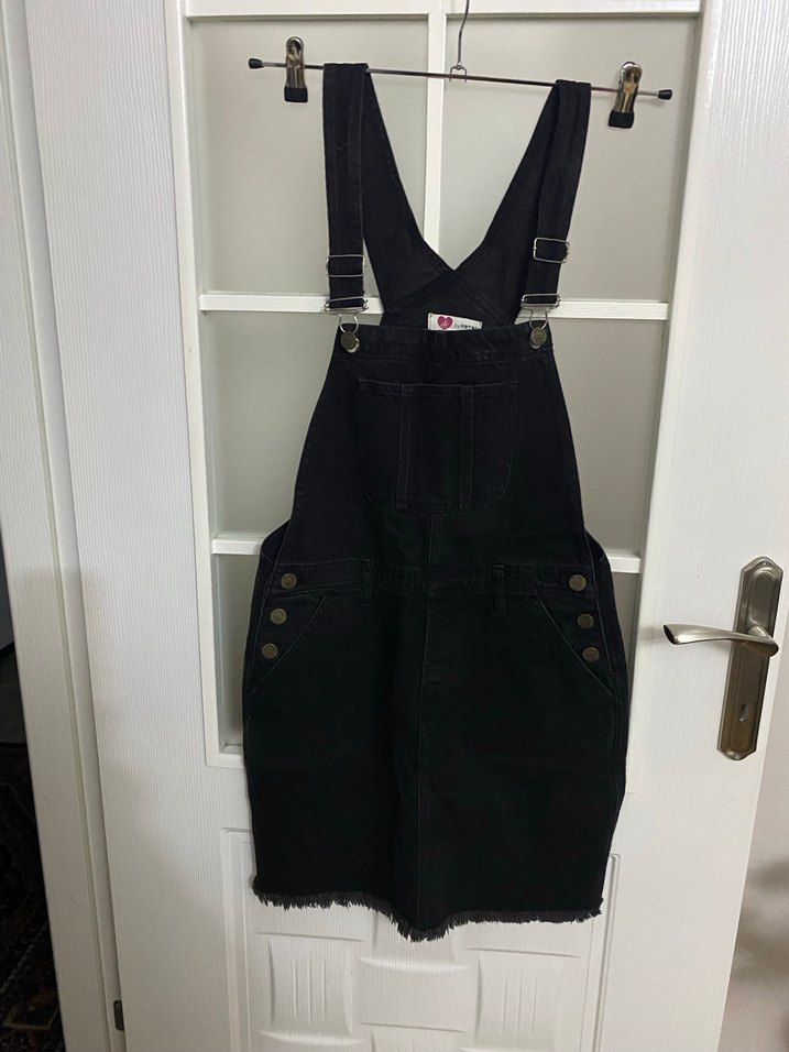 Kadın siyah denimden, askılı, straplez ve tokalı detaylı, midi boyda, yan düğmeli cepli salopet. Trendy ve günlük kullanıma uygun.