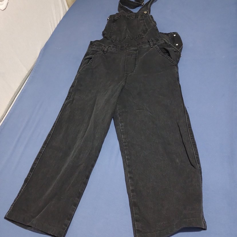 Siyah denimden, salaş kesim midi uzunlukta, tokalı askılı kadın tulumu. Notlu yaka stiliyle günlük ve sokak modasına uygun.