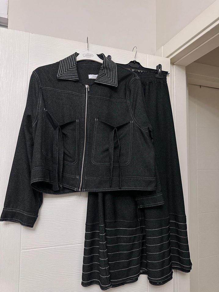 Kadın siyah denim takım, pileli etek ve fermuarlı, uzun kollu, kesik yaka ceket içerir. Sokak stiline uygun şık tasarım.
