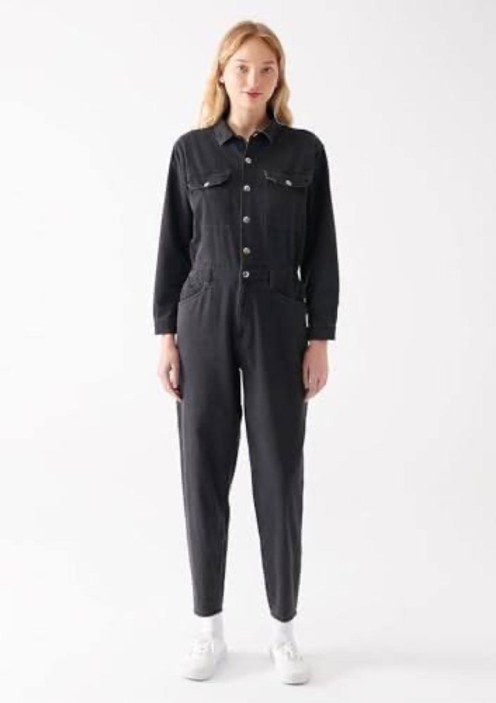 Kadın siyah denim tulum, normal kesim, uzun kollu ve kırlangıç yaka detaylıdır. Midi boyda ve desensiz olup, gündelik rahat kullanım için uygundur. Sokak modasında zahmetsiz şıklık sunar.