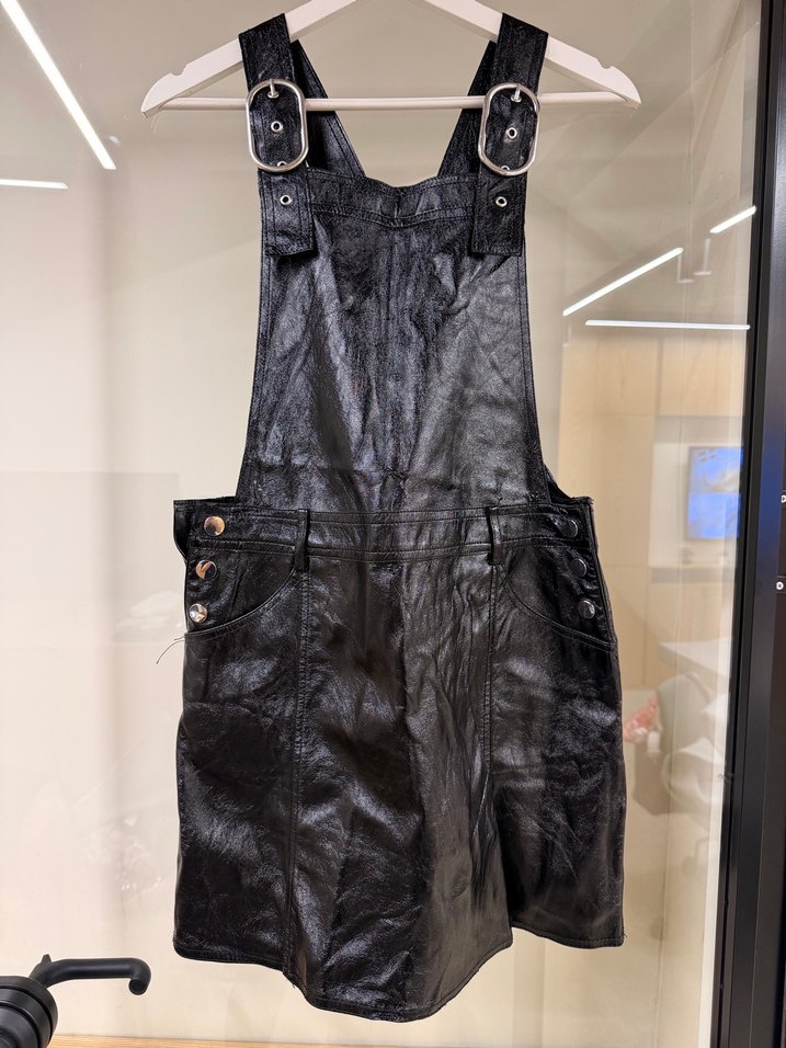 Fitted kesim siyah deri midi salopet, askısız yaka ve tokalı askılarla. Goth ve grunge punk tarzında, günlük kullanıma uygun.