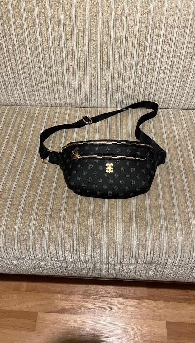 Ayarlanabilir kemer kayışı ve baskılı desenli siyah deri kadın bel çantası. Günlük kullanım için uygun, minimalist ve sokak stiline uygun tasarım.