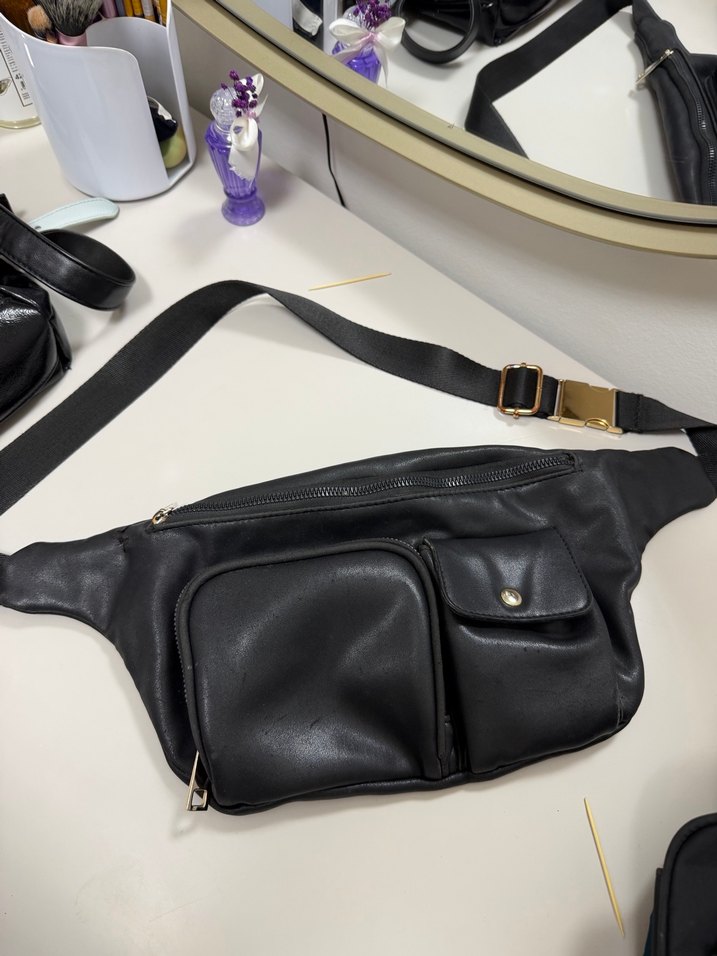 Kilitli tokalı siyah deri bel çantası, çoklu fermuarlı ve çıtçıtlı ceplerle günlük kullanım için uygundur. Minimalist sokak stili.