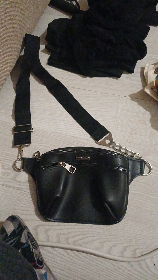 Siyah deri, tokalı kayışlı ve fermuarlı ön cepli kadın bel çantası, minimalist ve trend sokak stili için uygundur.