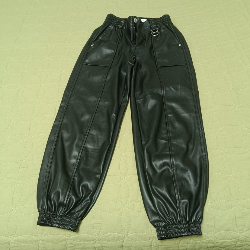 Siyah deri, bel detaylı, bol kesim ve lastikli paçalı pantolon, günlük sokak stili için uygundur. giyilmedi yeni bedeni 11_12 yaş ama 160 50_58 kg aralığına güzel olur