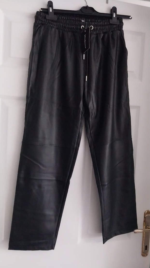 Siyah deri, beli lastikli bol kesim rahat pantolon, günlük kullanıma uygun, trend sokak stiliyle uyumlu.(bel 40 boy 93)
