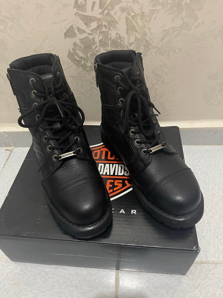 Siyah deri biker botlar, tokalı ve yüksek topuklu, baskılı desene sahip. Rock punk tarzı ve günlük kullanım için uygun.