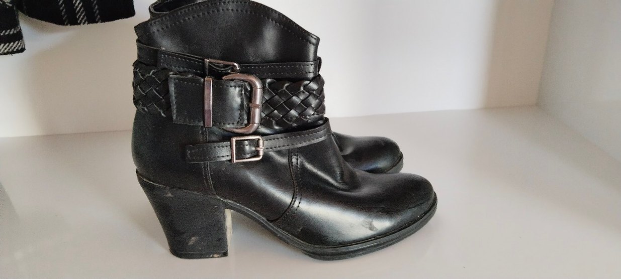 Blok topuklu, tokalı ve örgü detaylı siyah deri biker botlar, günlük şıklık için uygundur.