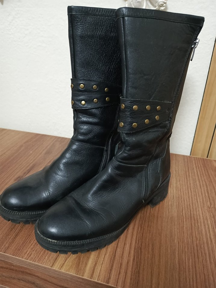 Siyah deri, tokalı kadın biker botları, blok topuklu ve grunge punk tarzında, günlük kullanım için uygundur. 38 numara ama 37 ye daha uygun