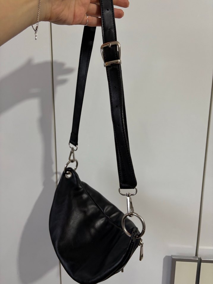 Siyah deri, tokalı kayışlı çapraz çanta. Minimalist biker tarzıyla günlük kullanıma uygun, modayı takip edenler için şık bir aksesuar.