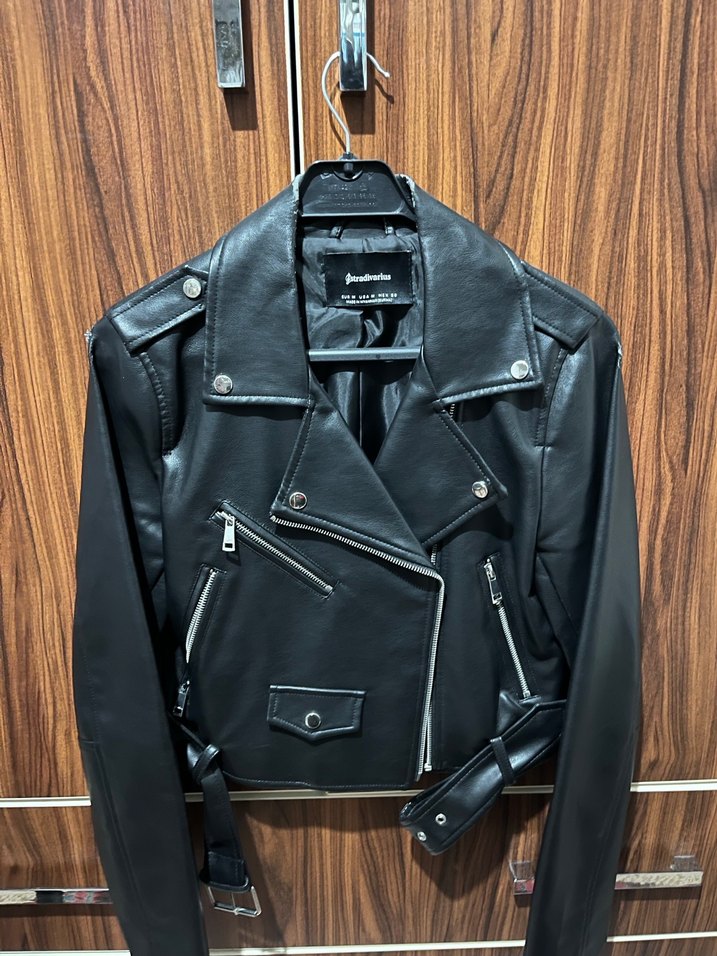 Kemer detaylı siyah deri biker ceket, keskin yakalı ve askılı kollu. Rahat kesim ve kısa boy ile rock punk tarzını yansıtır.