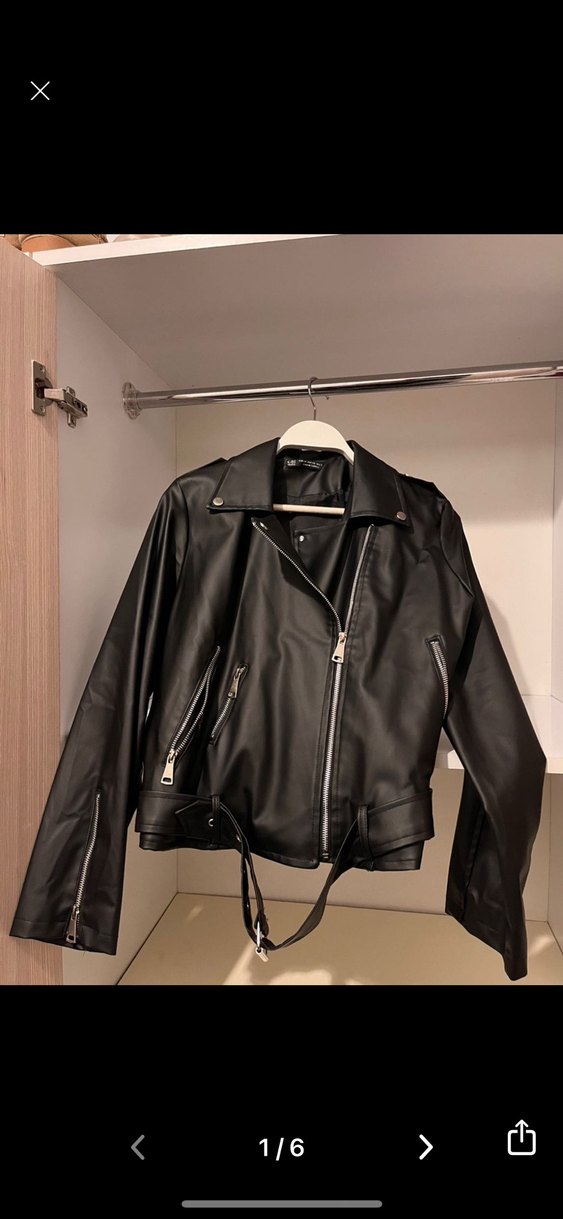 Siyah deri biker ceket, kesik yaka, askılı kollar ve kemerli bel detayına sahiptir. Normal kesim ve midi boyda, günlük kullanıma uygundur. Marka temsili