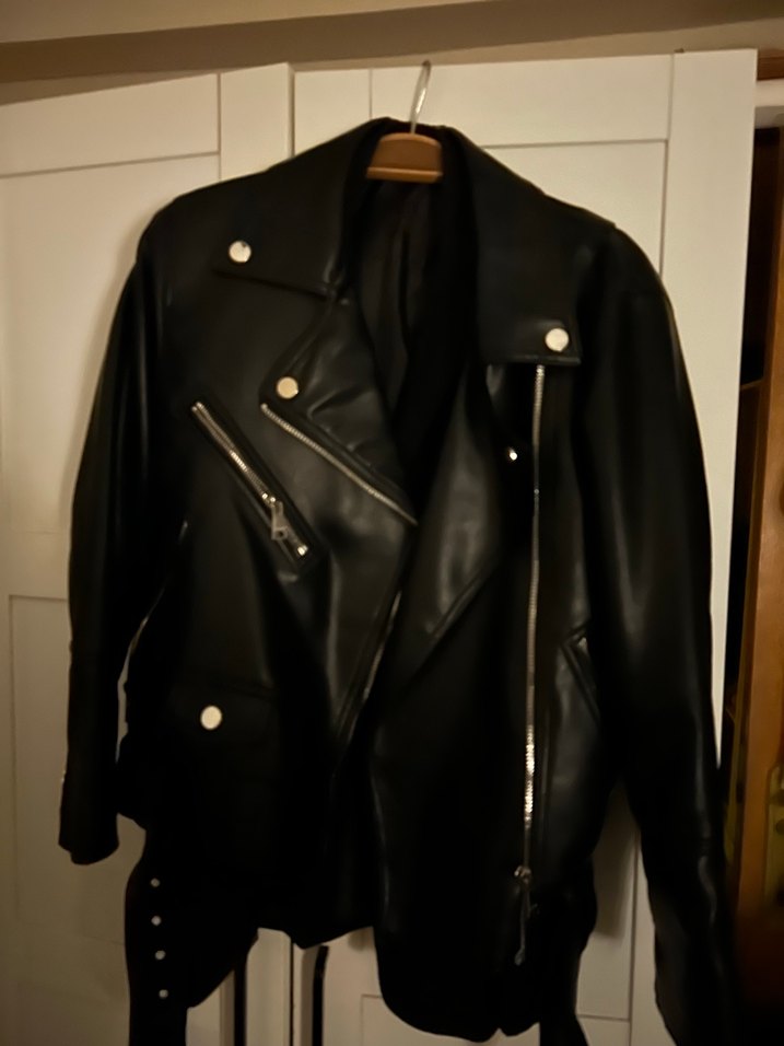 Siyah, fitted kesim kadın deri biker ceket, boyun kısmında birkac kullanımdan oturu aşınma mevcut ama boyun içinde kaldığı için giyildiğinde görülmüyor o yüzden fiyatı uygun tutuyorum