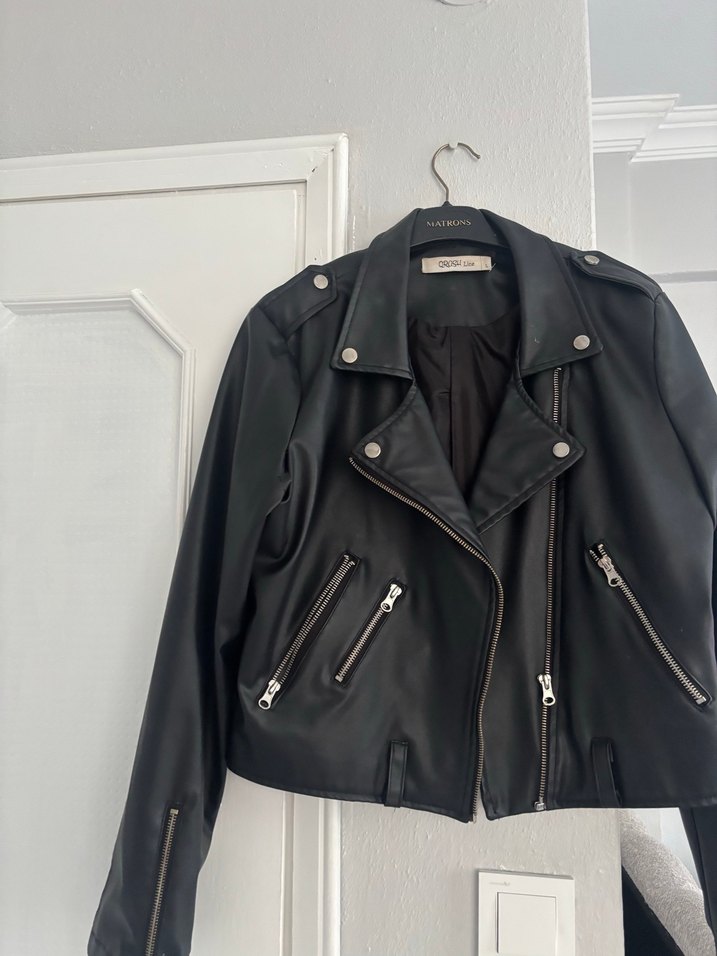 Fitted kesim siyah deri biker ceket, yakasında kesik detay ve fermuarlarla Paris tarzı rock punk havası taşıyor. Normal midi boyda, askılı kollu, günlük kullanıma uygun.