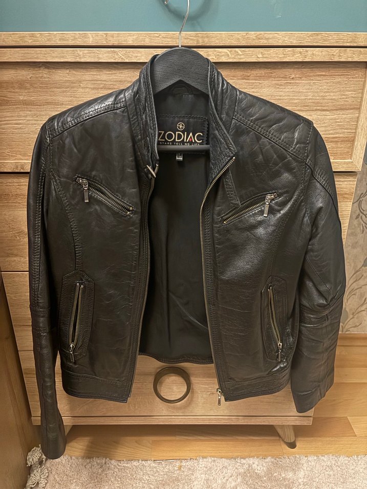 Dar kalıp Hakiki deri vintage deri biker ceket, kesik yakalı ve tokalı detaylara sahip. Uzun kollu, normal kesim ve baskılı desende, günlük kullanıma uygun. İç etiketinde "ZODIAC" yazıyor.