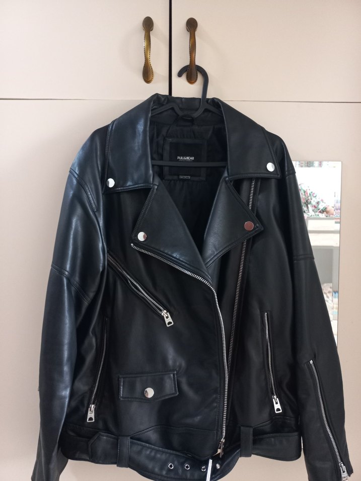 Siyah deri biker ceket, tokalı ve kesimli yakalı. Askılı kollu ve günlük kullanım için regular fit.