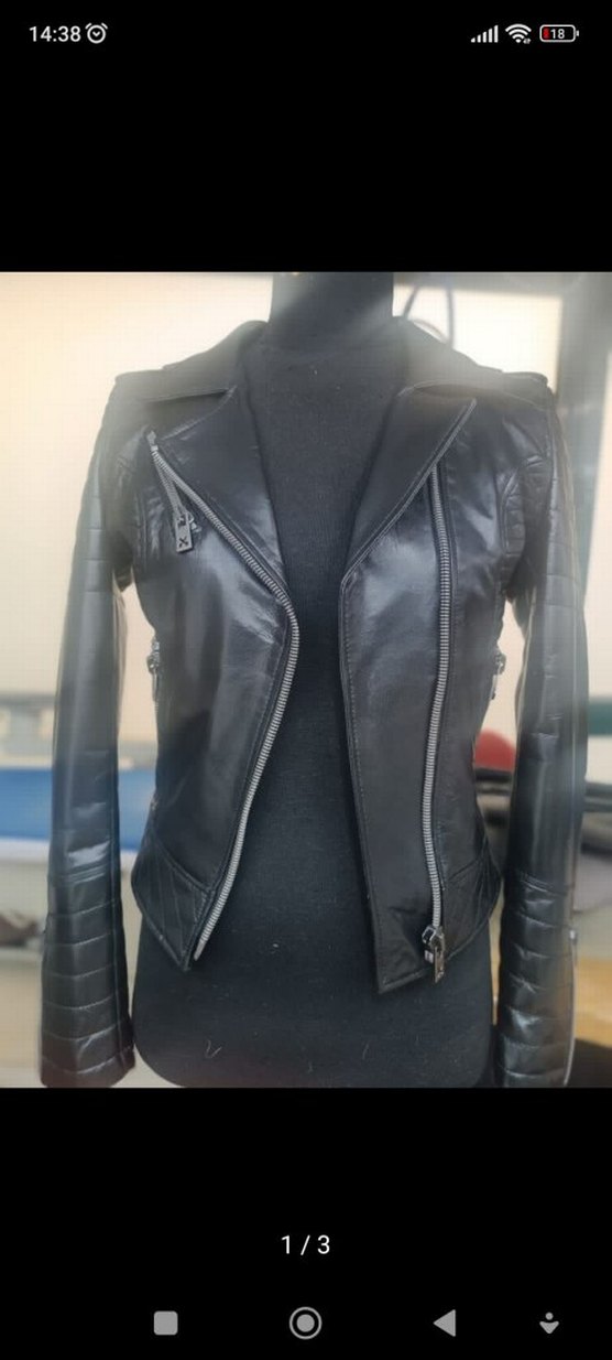 Siyah deri biker ceket, yaka kısmı kesik ve fermuarlı detaylara sahip. Askılı kollu ve normal kesim, günlük kullanım için uygun.