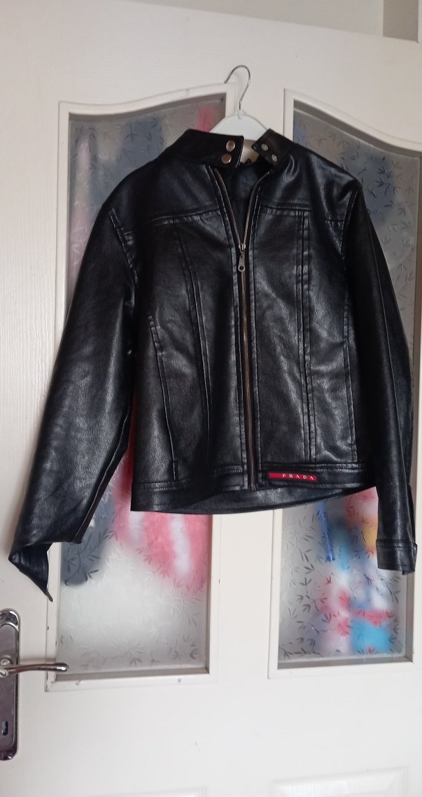 Bu siyah deri biker ceket, notalı yakalı ve fermuarlı ön kısmıyla dar kesimdir. Uzun kollu ve midi boyda, günlük kullanım için uygundur.