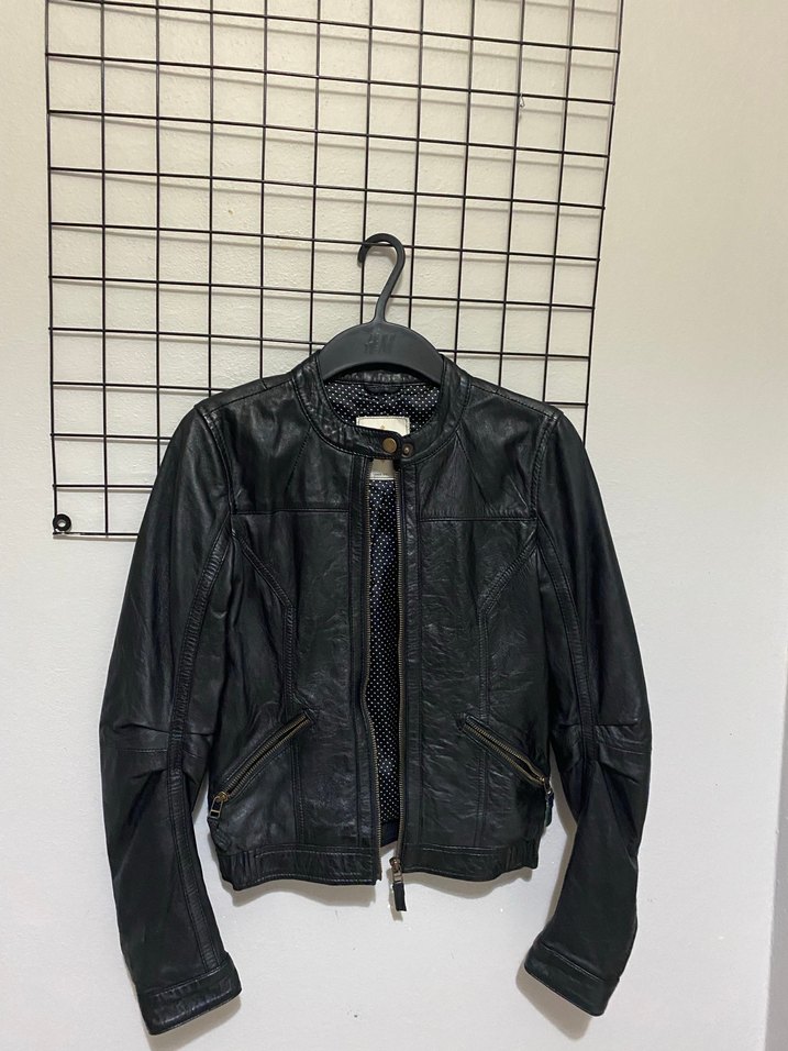 Fitted kesim siyah deri biker ceket, yakasında kesik detay ve kayışlı kollara sahip. Tokalı detaylar ve fermuarlı cepler bulunur, günlük kullanıma uygun rock punk tarzı.