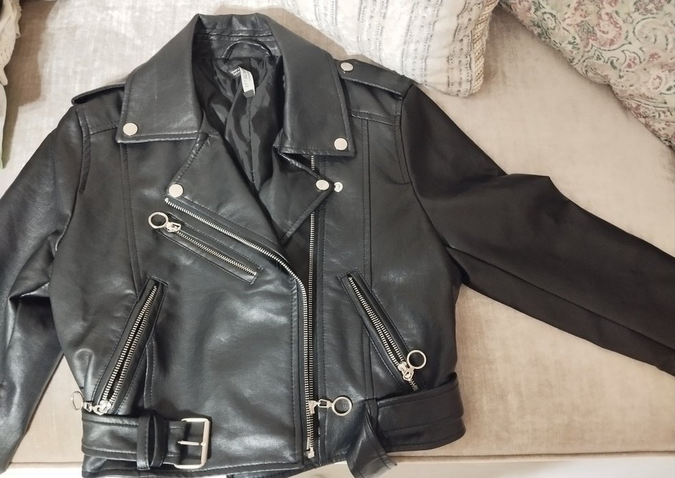 Siyah, fitted kesim deri biker ceket, yakalı ve kayışlı kolları ile. Metal fermuarlar ve tokalı detaylara sahip, normal boyda, grunge punk tarzında.