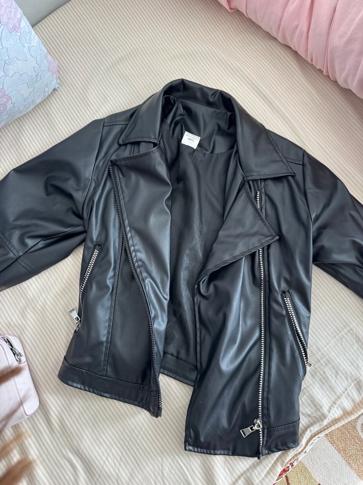 siyah deri biker ceket, yaka ve fermuarlı ceplerle sokak stiline uygun, günlük kullanım için idealdir.