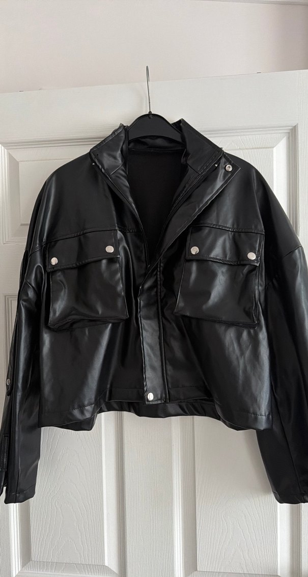 Siyah deri biker ceket, bol kesim ve düğmeli ceplerle. Çentikli yaka ve askılı kollara sahip, günlük rahat kullanım için uygundur. Omzundaki düğme kapanmıyor sadece
