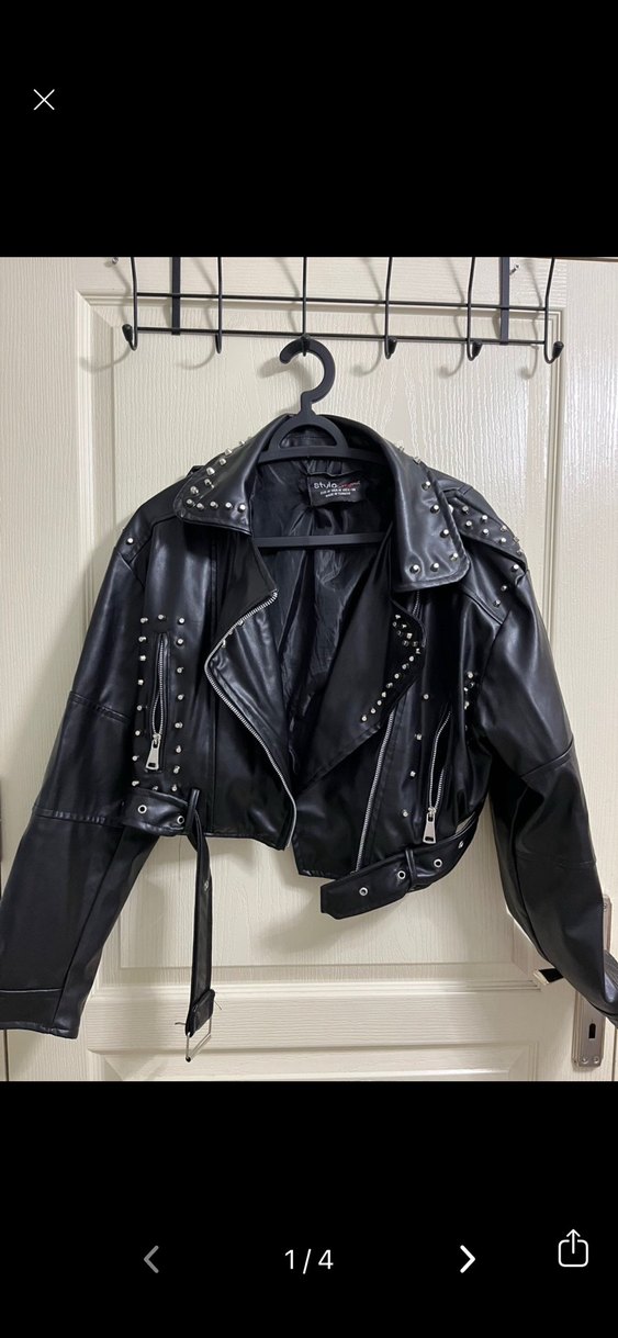 Bu siyah deri biker ceket, strappy kollu ve kesimli yakalı, fitted kesime sahiptir. Tokalı ve metal çivili detaylar içerir, günlük kullanıma uygun grunge punk tarzını yansıtır.
