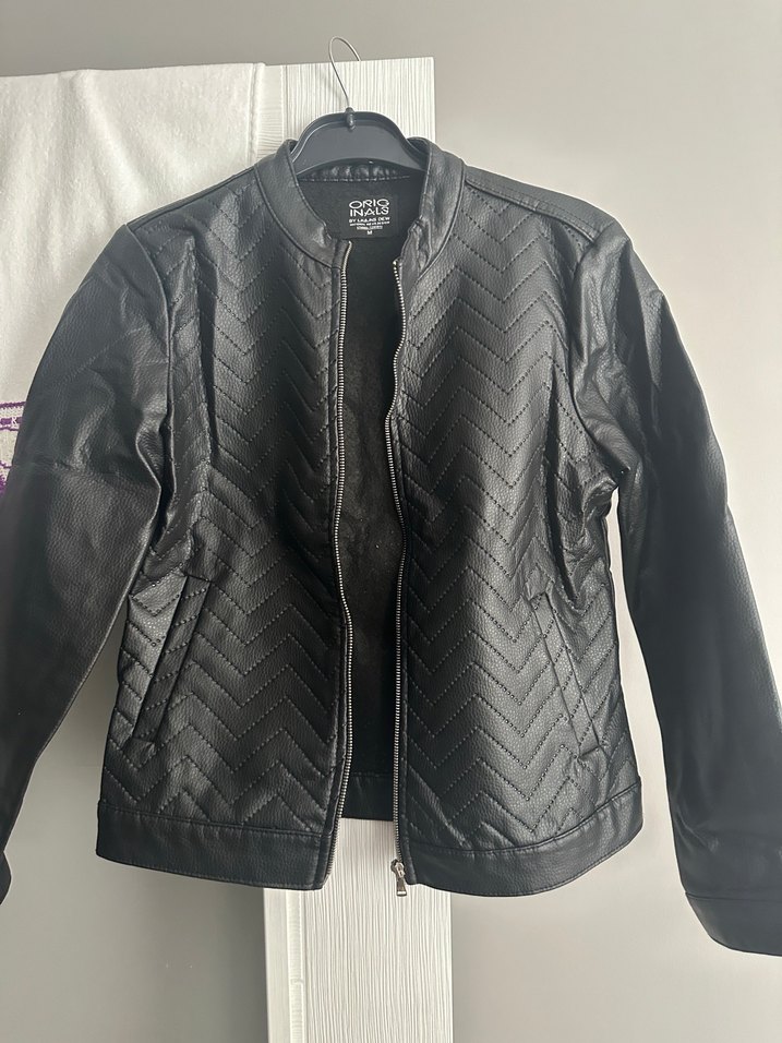 Siyah, fitted kesim deri biker ceket, fermuarlı ve strappy kolludur. Notch yaka ve normal boyda olup, günlük kullanıma uygundur.