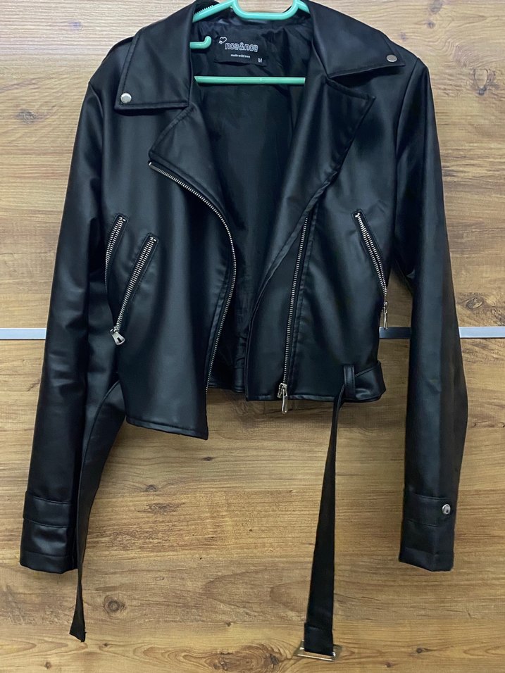 Siyah, dar kesim deri biker ceket, yakasında kesik yaka ve tokalı kayışlar bulunur. Fermuarlı cepleri ve normal boy uzunluğu vardır.