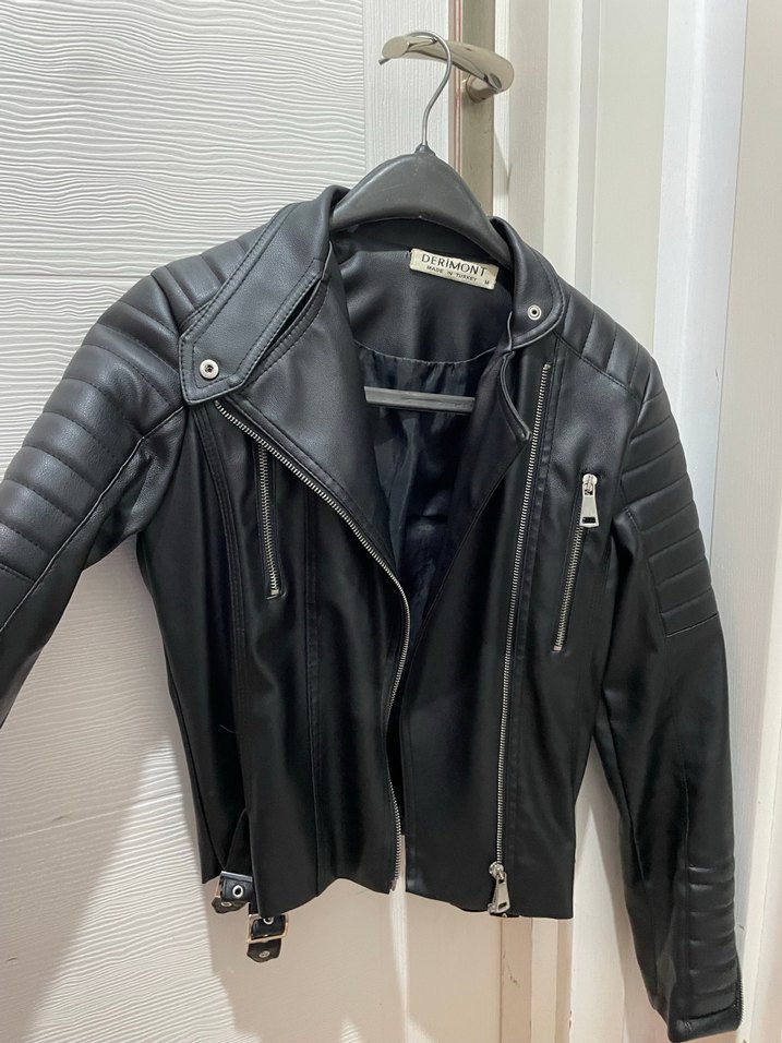 Fermuarlı detaylara sahip siyah, ince kesim deri biker ceket. Notlu yaka ve askılı kollarıyla rock punk havası taşır. Midi boy. Ürün fazlalığı