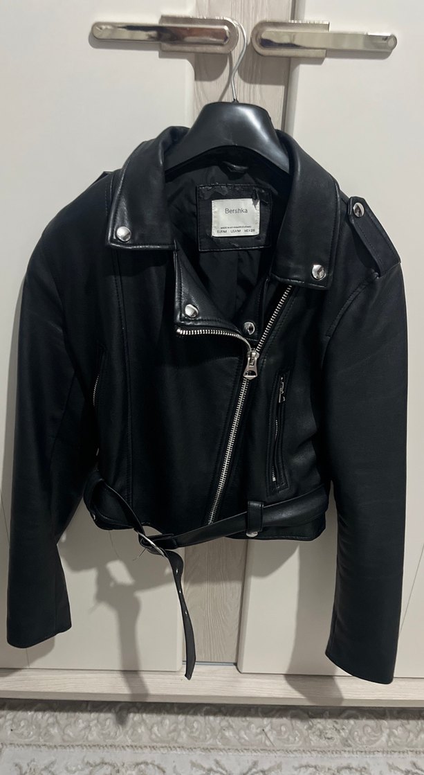 Siyah deri, fitted biker ceket. Notch yakalı, kemerli ve midi boyda. Strappy kollu, günlük kullanım için uygun punk tarzı. Deri soyulmaları mevcut