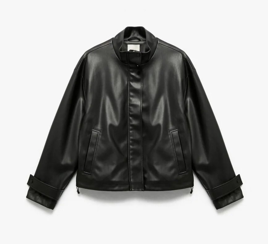 Siyah deri biker ceket, yüksek yakalı ve fermuarlı ön detaylıdır. Uzun kollu ve normal kesim olan bu model, günlük kullanıma uygundur. Minimalist ve desen içermeyen tasarımıyla şık bir görünüme sahiptir.