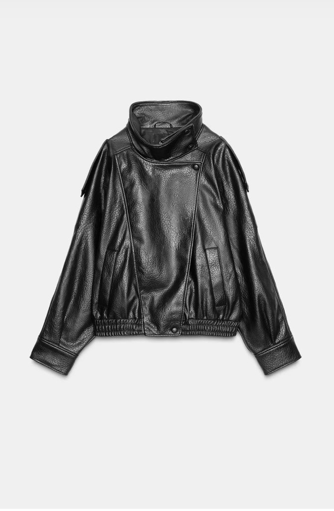 Siyah deri biker ceket, yüksek yakalı ve uzun kollu, kemerli tasarıma ve bol kesime sahip. Günlük kullanıma uygun, trend ve avangart stil için ideal.